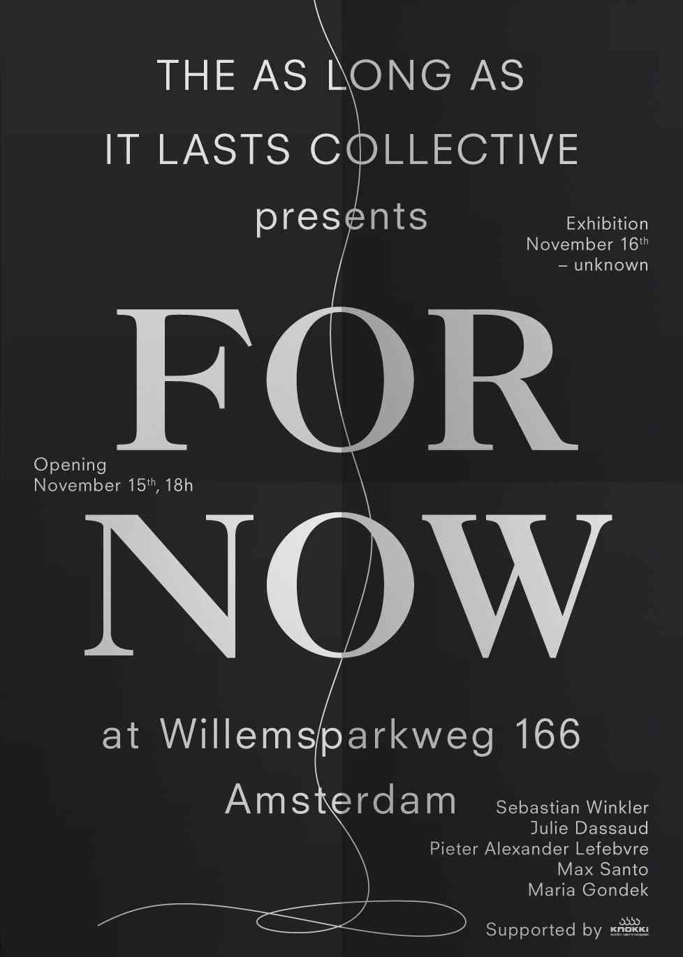 The exhibition For Now, presented by The As Long As It Lasts Collective, takes place in a former furniture shop, the RJ Home Collections. Past, present and future of this particular location are highly intertwined: currently vacant and waiting for a new, yet unknown purpose, the space is still carrying traces of its previous func- tion. As we do not know when the new tenant will start to make use of the venue, the duration of this exhibition is uncertain.