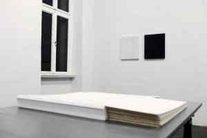 Lilia Kovka schafft in ihrer Arbeit o.T. einen sich ständig verändernden Raum, der für uns nur mit Blicken begehbar ist. Die zu einem Buch gebundenen Passepartouts, allesamt Fundstücke, ergeben stets neue geometrische Gebilde, architektonischen Grundrissen gleich, die mit jeder umgeblätterten Seite ihre Tiefen und die freiwerdenden Perspektiven verändern. Lilia Kovka konstruiert so mehrere Räume innerhalb eines Mediums, mit dem im herkömmlichen Sinne allenfalls gedanklich betretbare, nicht aber einsehbare Orte geschaffen werden.