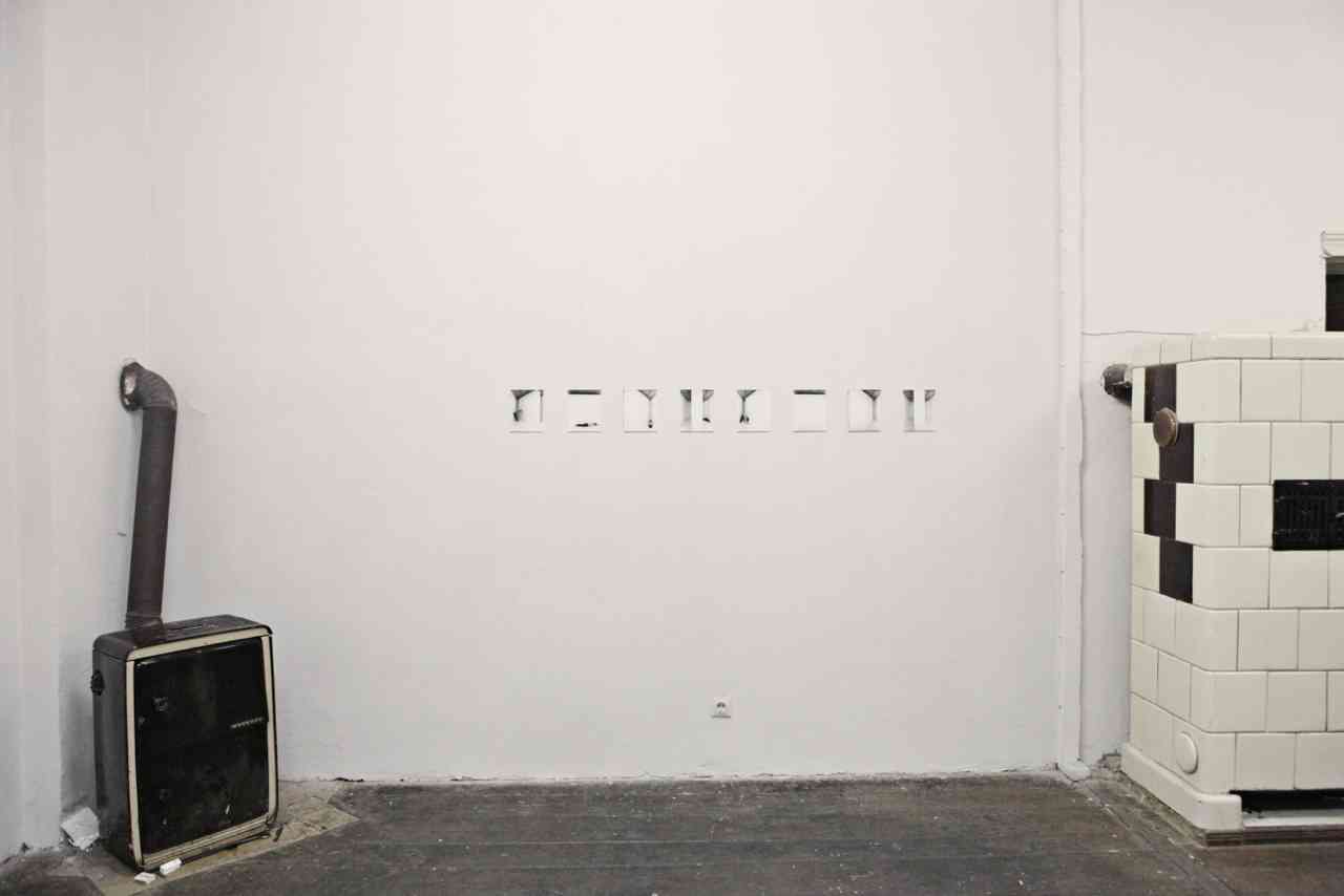Lilia Kovka schafft in ihrer Arbeit o.T. einen sich ständig verändernden Raum, der für uns nur mit Blicken begehbar ist. Die zu einem Buch gebundenen Passepartouts, allesamt Fundstücke, ergeben stets neue geometrische Gebilde, architektonischen Grundrissen gleich, die mit jeder umgeblätterten Seite ihre Tiefen und die freiwerdenden Perspektiven verändern. Lilia Kovka konstruiert so mehrere Räume innerhalb eines Mediums, mit dem im herkömmlichen Sinne allenfalls gedanklich betretbare, nicht aber einsehbare Orte geschaffen werden.