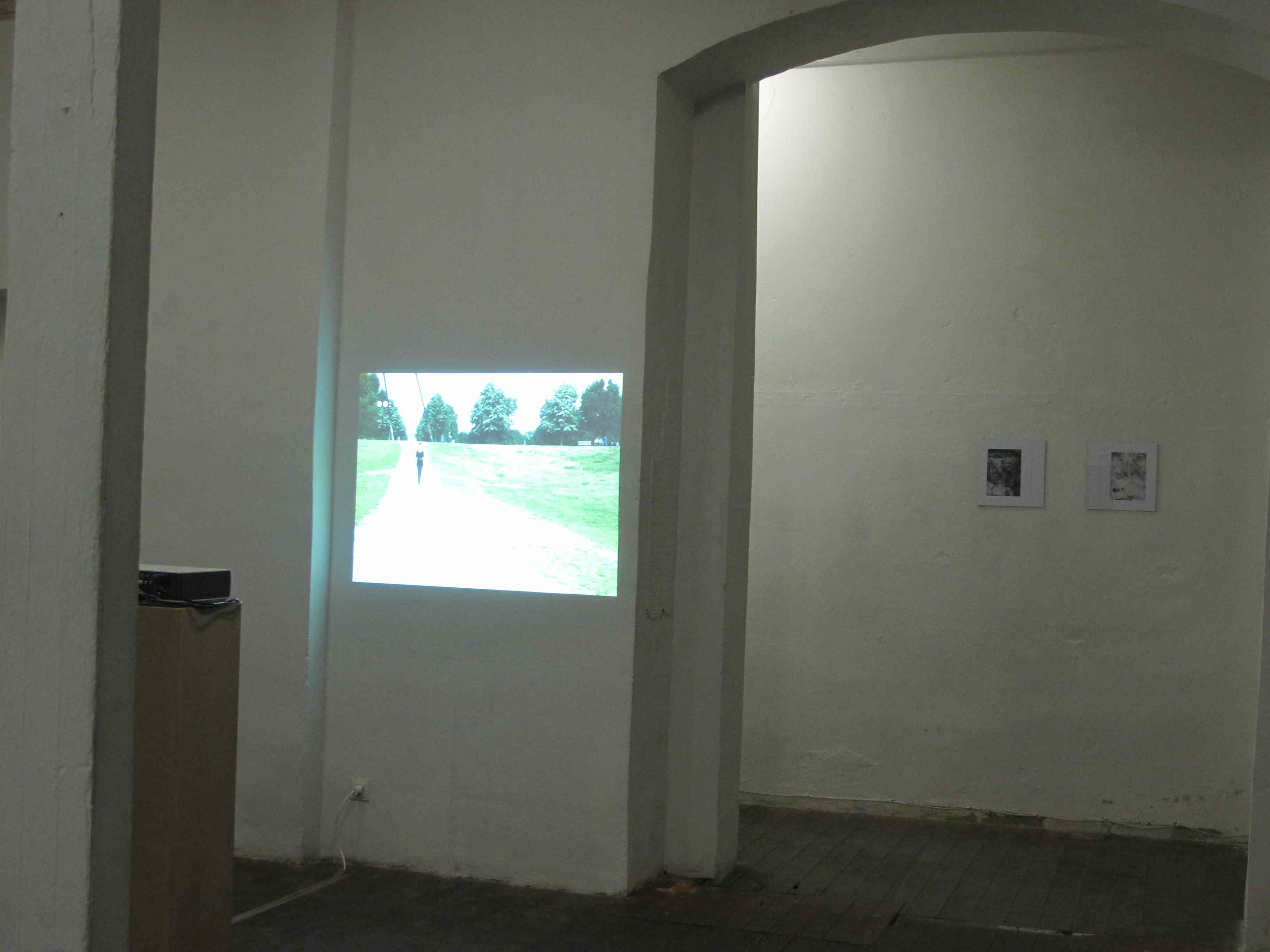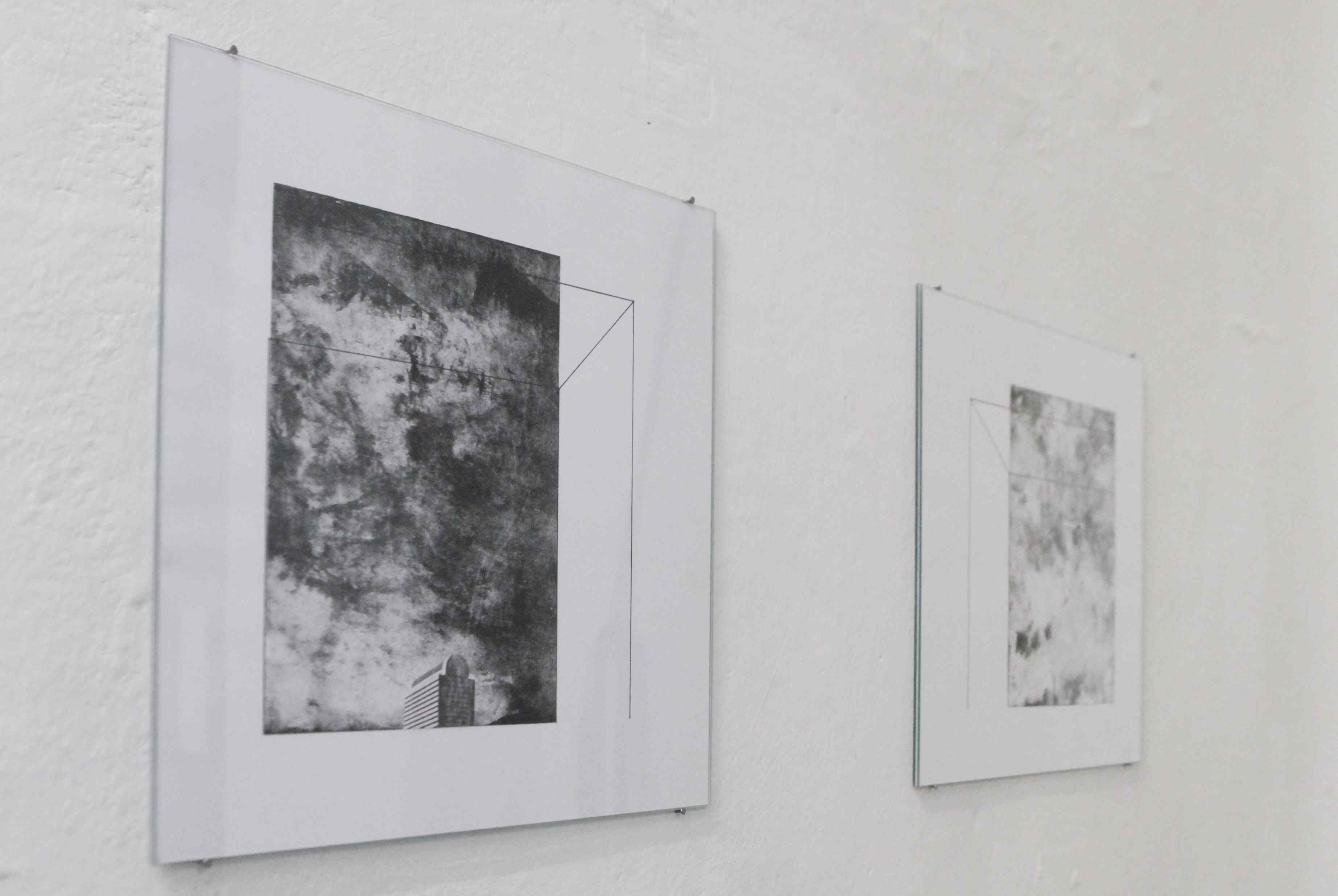 Auch die Arbeit Verortung von Sebastian Winkler erfordert eine Anpassung des Betrachters: Der fragile Drahtquader verhindert das Durchqueren des Raumes, in dem er installiert ist und wirkt sich somit verändernd auf ihn aus. Gleichzeitig bestimmt der bestehende Ort die Maße des Quaders und stellt den Bezugspunkt für den neu entstandenen Raum dar. Die Linien, als raumdefinierendes Element, treten auch in den Arbeiten Randbebauung # 3 und Randbebauung # 7 auf. Als Grundlage der Collagen verwendete Sebastian Winkler ein Abfallprodukt, wie es bei Tiefdruckverfahren entstehen kann. Die Überreste der Farbe bilden ein Nebeneinander und Übereinander undefinierbarer, zufälliger Formen und Strukturen, in welchem die akkuraten Linien einen ungewissen, nicht lokalisierbaren Ort abstecken. Erst durch die hinzugefügten Architekturelemente, verkleinerte Ausschnitte aus einem Magazin für Architektur- Projekte, wird eine Verortung möglich. Wie die In-Situ-Arbeit, sind auch Randbebauung #3 und Randbebauung #7 eine Auseinandersetzung mit der persönlichen Orientierung im Raum.