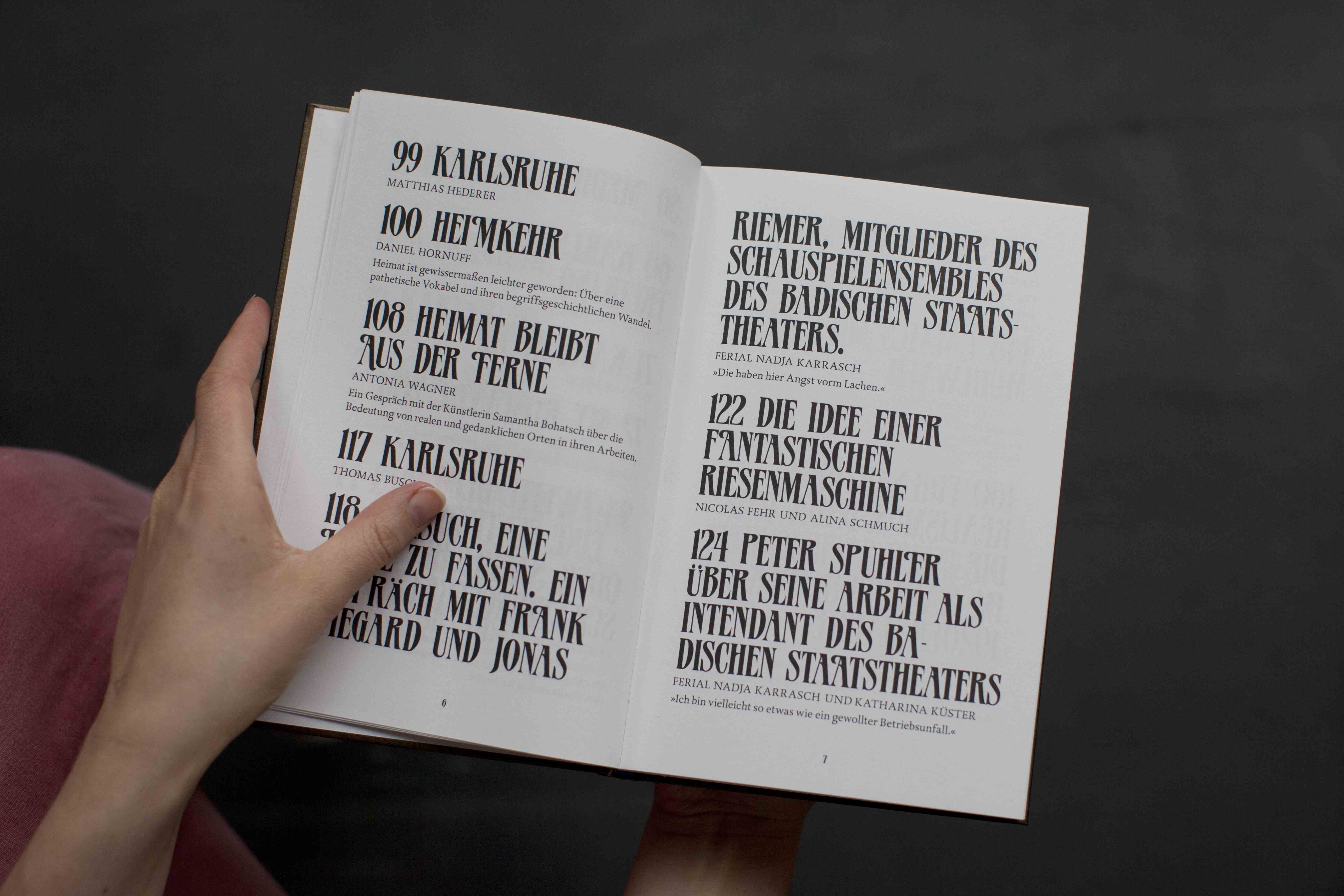 Die theoretischen, künstlerischen und essayistischen Beiträge aus unterschiedlichen Fachbereichen der HfG sowie aus dem Umfeld der Hochschule, wie dem Badischen Staatstheater und der Staatlichen Akademie der Bildenden Künste Karlsruhe, ergeben ein heterogenes Bild der Stadt. Sie führen den Interessierten an Orte, die ihre Besonderheit erst auf den zweiten Blick offenbaren, sie sind Dokumente von in der Stadt Erlebtem und Ausdruck von an der Stadt Vermisstem.