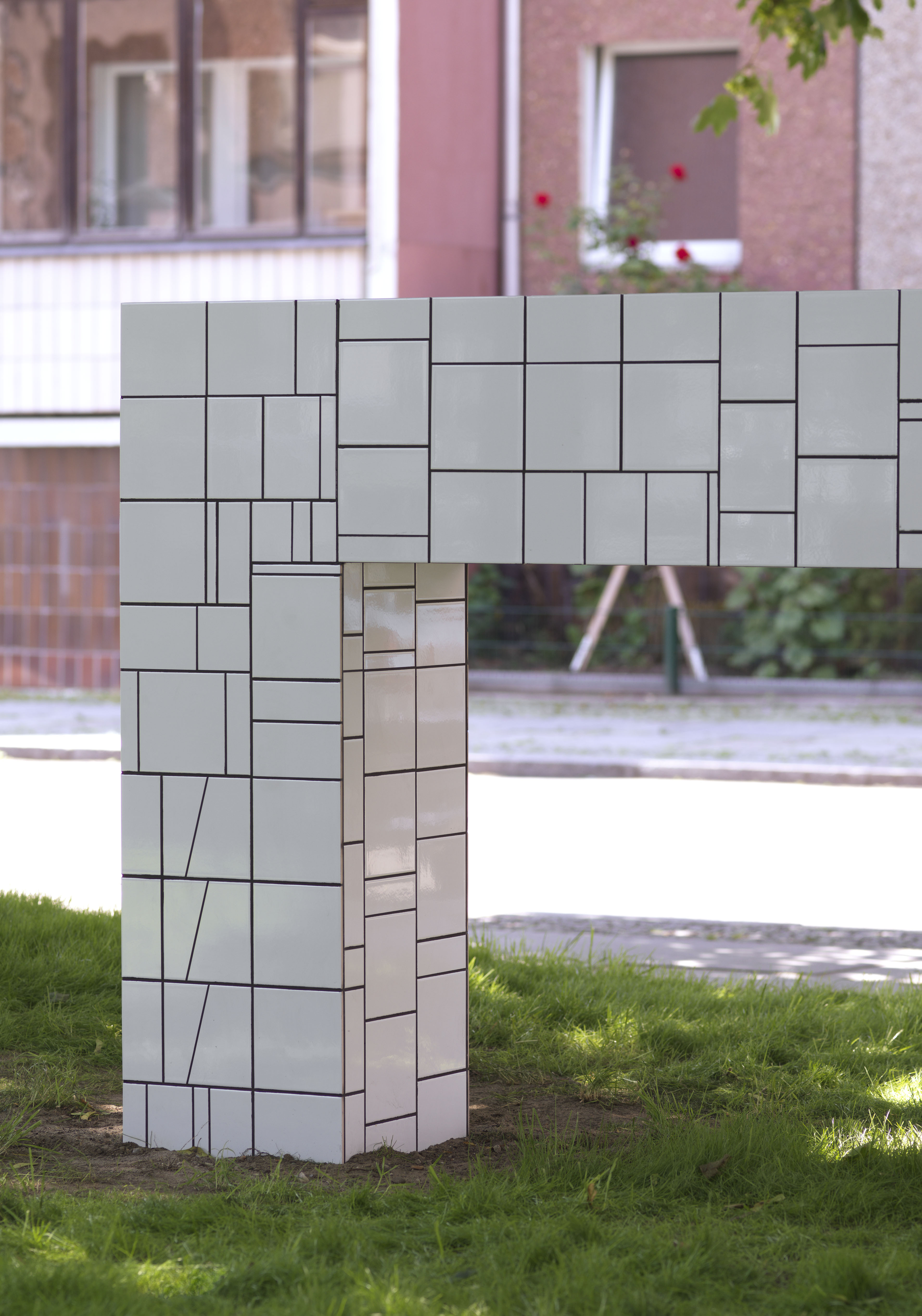 Hier hat der Künstler Simon Mullan (*1981, lebt in Berlin) seine Arbeit Popularis (Tresen) installiert; eine lange, weiß geflieste Skulptur, die sich im gleichen Maße von ihrer Umgebung abhebt, wie sie hierher zu gehören scheint. Die Symmetrie ihrer Gestalt, die geraden Kanten der unterschiedlich zugeschnittenen Kacheln und die grauen Fugen, die sich von Weitem wie eine abstrakte Zeichnung über die Oberfläche ziehen (eine wunderbare Unsicherheit beim Betrachten: was macht dieses Kunstwerk aus? Sind es die Kacheln oder das Dazwischen?) stehen in Kontrast zum eigenwilligen Wuchs der Bäume und zum grellen Grün des Rasens. Gleichzeitig ist die Skulptur genau richtig hier, ist kein Fremdkörper, sondern stimmige Ergänzung des Ortes.