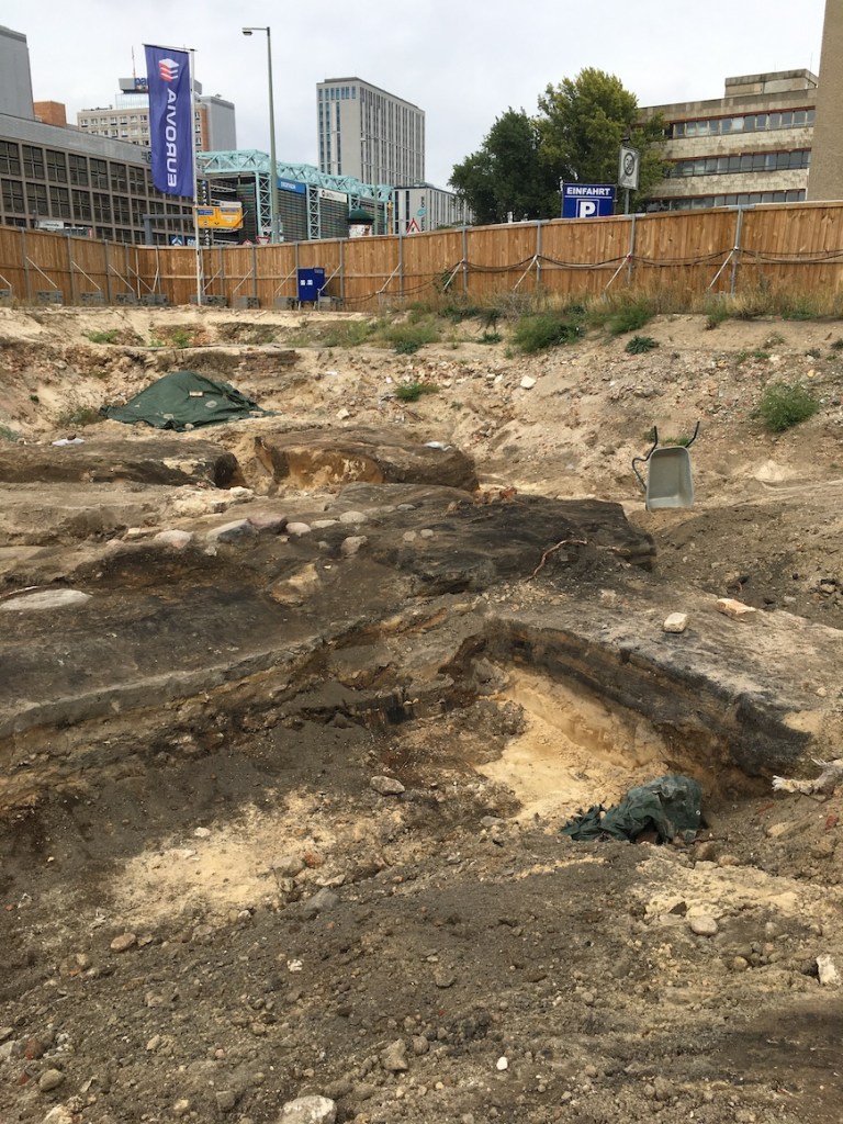 Von dieser Zeit zeugen die derzeit ältesten Befunde auf der aktuellen Ausgrabungsstätte, zu der man über eine hinabführende Treppe gelangt – das Leben in Alt-Berlin fand einige Meter unterhalb der heutigen Laufhöhe statt. Eingefasst von einer freigelegten Backsteinwand und einem Bodenprofil, das die unterschiedlich gefärbten Ablagerungsschichten deutlich erkennen lässt, wird der Blick auf einen im 13. Jahrhundert angelegten Graben frei, aus dem zarte Bäumchen wachsen. Ein paar Meter entfernt hiervon befindet sich ein mittelalterlicher Abfallschacht, dessen Holzrahmen sich erstaunlich gut erhalten hat und in dem neben Scherben von Gefäßen und Töpfen auch ein Jahrhunderte alter Lederschuh gefunden wurde. Zu verdanken ist dies dem Substrat aus organischen Materialien, das sich in dem Schacht anreicherte und so für eine luftdichte „Aufbewahrung“ der hier entsorgten Gegenstände sorgte.