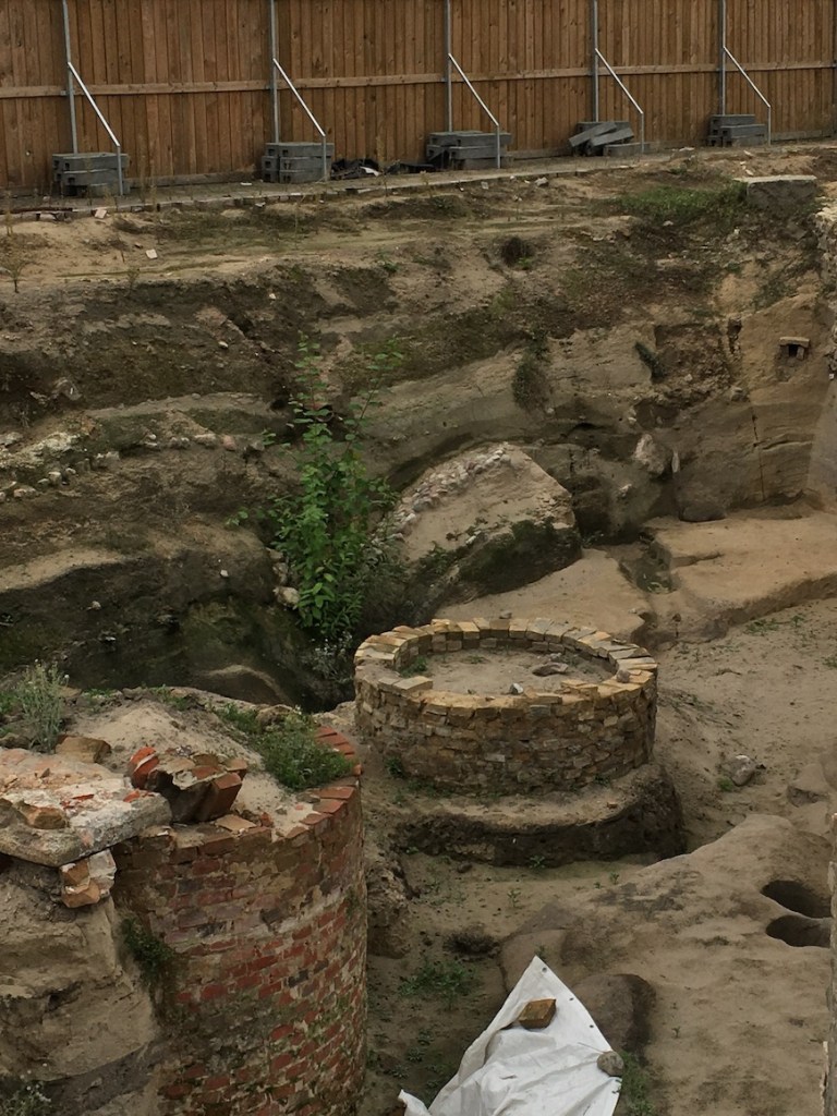 In unmittelbarer Nachbarschaft zum Graben, allerdings zeitgeschichtlich einige Jahrhunderte entfernt, befindet sich der Überrest eines rot gepflasterten Kellers aus der ersten Hälfte des 19. Jahrhunderts. Hieran schließen Sickerschächte aus der zweiten Hälfte des 19. Jahrhunderts an, ein Kamin, dessen Innenwände noch schwarz gefärbt sind, sowie zwei Brunnen aus dem 18. und dem 19. Jahrhundert. Die Befunde lassen vermuten, dass sich an dieser Stelle ein Hinterhof befand, erklärt Malliaris.