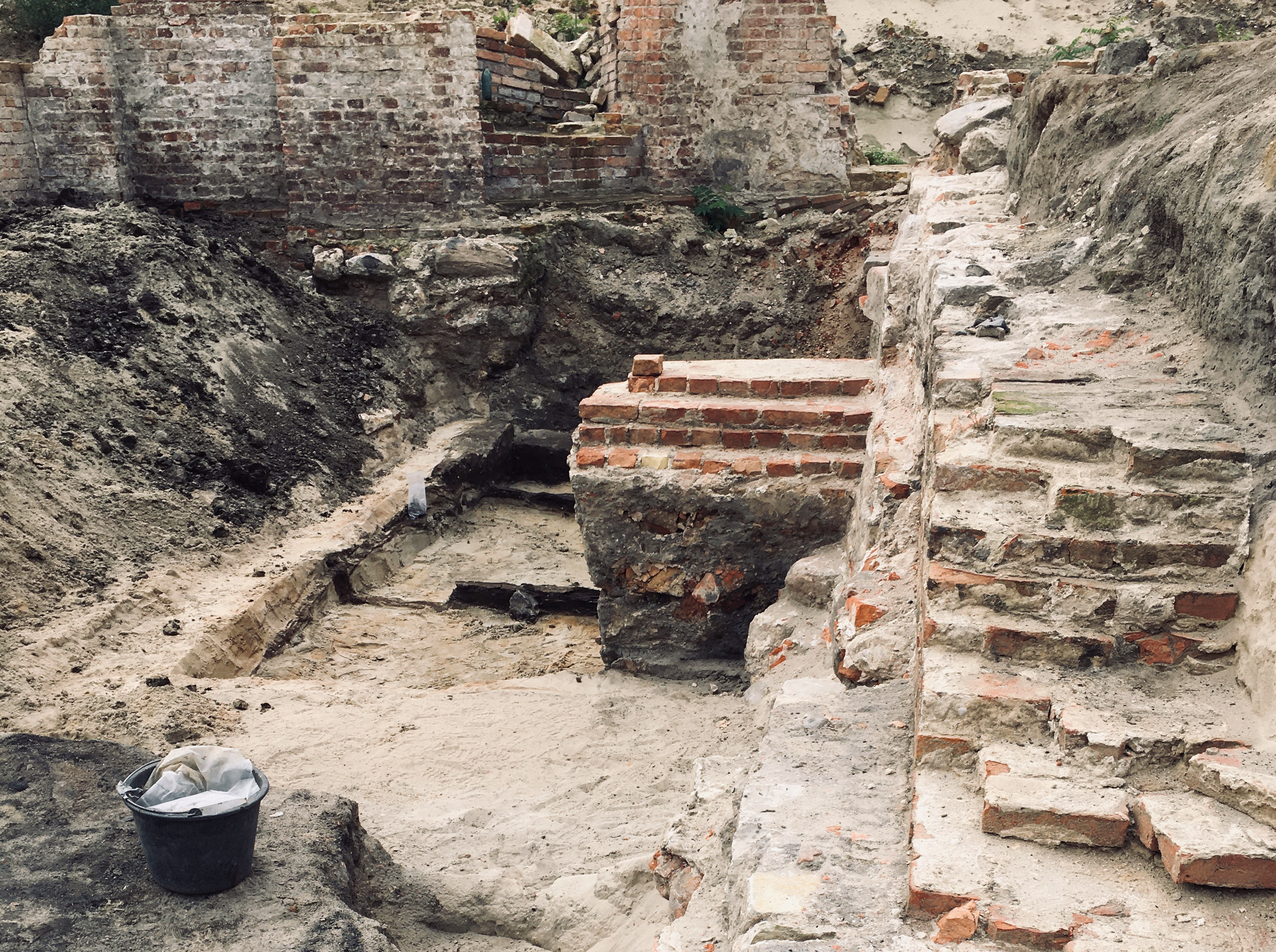 In unmittelbarer Nachbarschaft zum Graben, allerdings zeitgeschichtlich einige Jahrhunderte entfernt, befindet sich der Überrest eines rot gepflasterten Kellers aus der ersten Hälfte des 19. Jahrhunderts. Hieran schließen Sickerschächte aus der zweiten Hälfte des 19. Jahrhunderts an, ein Kamin, dessen Innenwände noch schwarz gefärbt sind, sowie zwei Brunnen aus dem 18. und dem 19. Jahrhundert. Die Befunde lassen vermuten, dass sich an dieser Stelle ein Hinterhof befand, erklärt Malliaris.