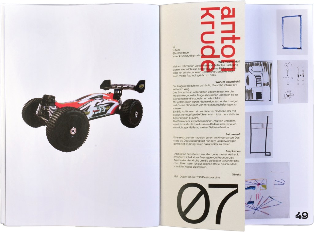 Anhand unterschiedlichster Medien, von Fotografie über Zeichnung und Malerei, bis hin zu Textarbeiten geben die Jugendlichen einen beeindruckenden Einblick in ihre Welt. Ein kurzer Fragebogen – in gesondertem Format – gibt Aufschluss über die Motivation und Inspiration der „Künstlerinnen“ und „Künstler“.