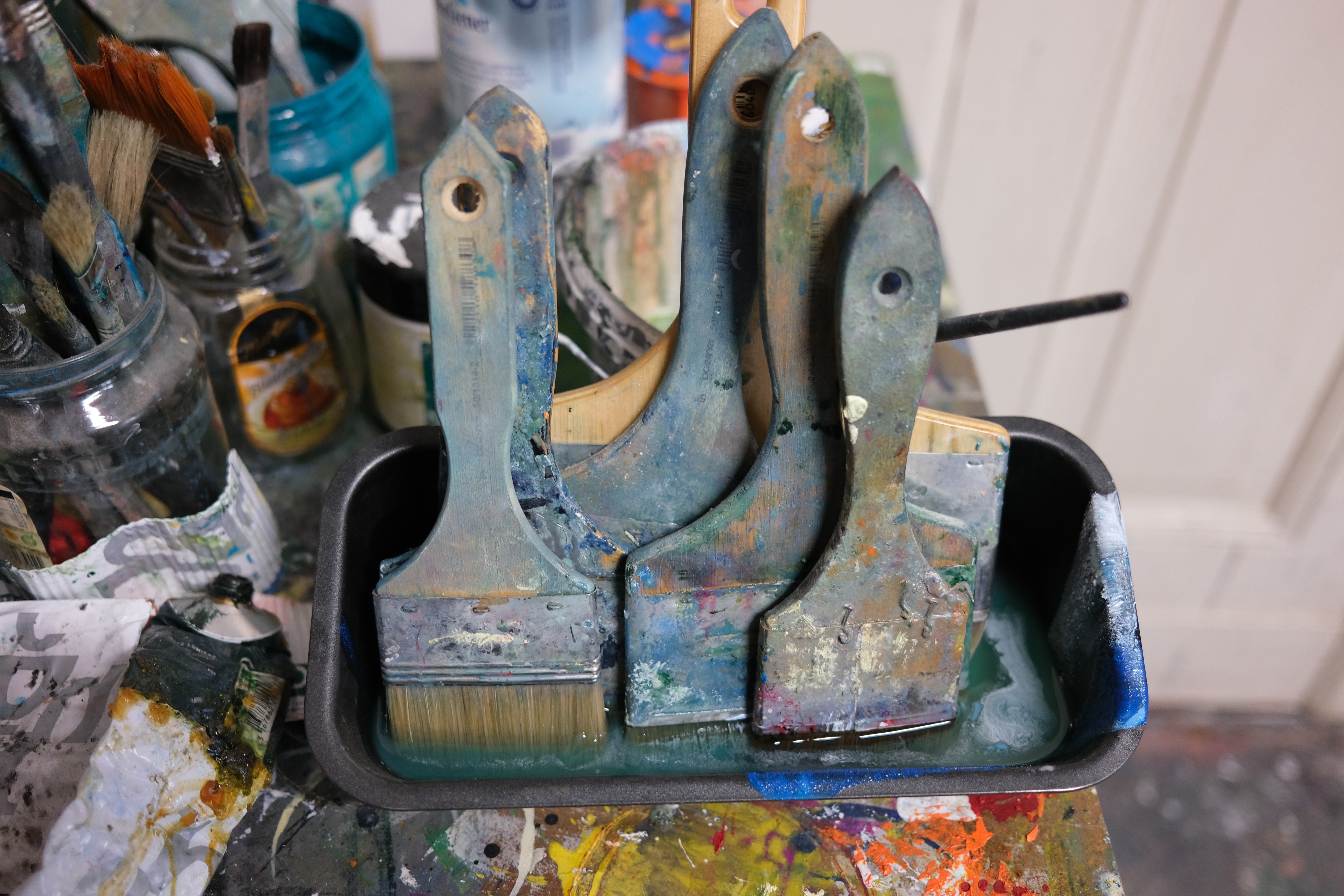Ich treffe die Künstlerin Clara Brörmann in ihrem Atelier in Berlin-Friedrichshain. Bei Betreten der Räume steigt mir sofort der Geruch nach Lösungsmitteln und Farben in die Nase – unverkennbar der Arbeitsort einer Malerin. Im Gang, gegenüber des Eingangs lagern großformatige Leinwände.