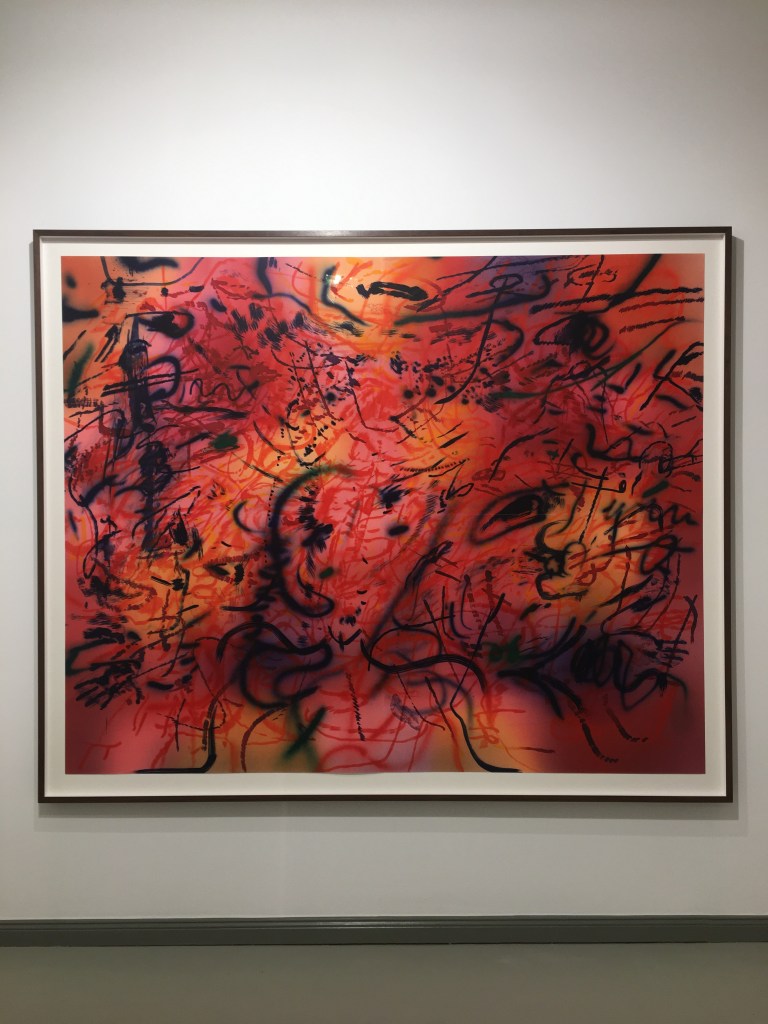 Ein gewaltiger Theorie-Berg schiebt sich da vor die Arbeiten; sind erst einmal ein paar Stunden Lektüre nötig, um sich den Drucken intellektuell gewachsen zu fühlen? Nein, man muss sich nicht von dem inhaltlichen Beiwerk einschüchtern lassen (nichts gegen die Pressemitteilung, das sei an die dieser Stelle hinzugefügt!). Essay, Gedicht und das letzte Buch des Neuen Testaments lassen sich unter dem kleinsten gemeinsamen Nenner zusammenfügen: Es geht um den von Chaos bestimmten Moment, um eine Zuspitzung, die bald den Kollaps herbeizuführen droht. Das klingt bekannt. Dieser Gedanke dürfte jeder und jedem in den letzten Jahren ein ums andere Mal gekommen sein. Denn unsere Zeit ist exakt ein solcher Moment: An allen Ecken und Enden brodelt es, unsere Wirklichkeit wackelt. Die dringlichen Herausforderungen des Klimawandels, der Aufstieg des faschistischen Autoritarismus, die Pandemie, all das rüttelt ordentlich an unserem Weiter-wie-bisher. Und eh man sich versieht, ist man mittendrin in den jeweils 1,70 mal 2,08 Meter großen Drucken als Teil des wilden Durcheinanders der gestischen Striche, Linien, Bögen, die über das Papier rasen und sich stellenweise zu Schriftzeichen und Symbolen formieren, ohne uns jedoch eine Information zu bieten. Assoziationen an Höhlenmalereien, Graffiti an Hauswänden, den Abstrakten Expressionismus tauchen auf, oder auch: ein Wutausbruch, eine Explosion, ein Sturm. Hier wirken Kräfte, die aus Ordnung Unordnung und aus einem Ganzen viele durcheinander wirbelnde Einzelteile machen.