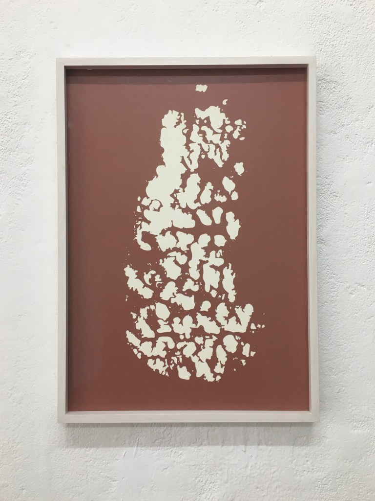 Daneben hängt an der Wand ein gerahmtes Bild: Eine abstrakte Formation – sie lässt an eine kleinteilige Inselgruppe denken -, die durch Herausschneiden oder Herausstanzen aus einer rostbraunen Fläche entstand und das dahinter liegende weiße Papier sichtbar macht.