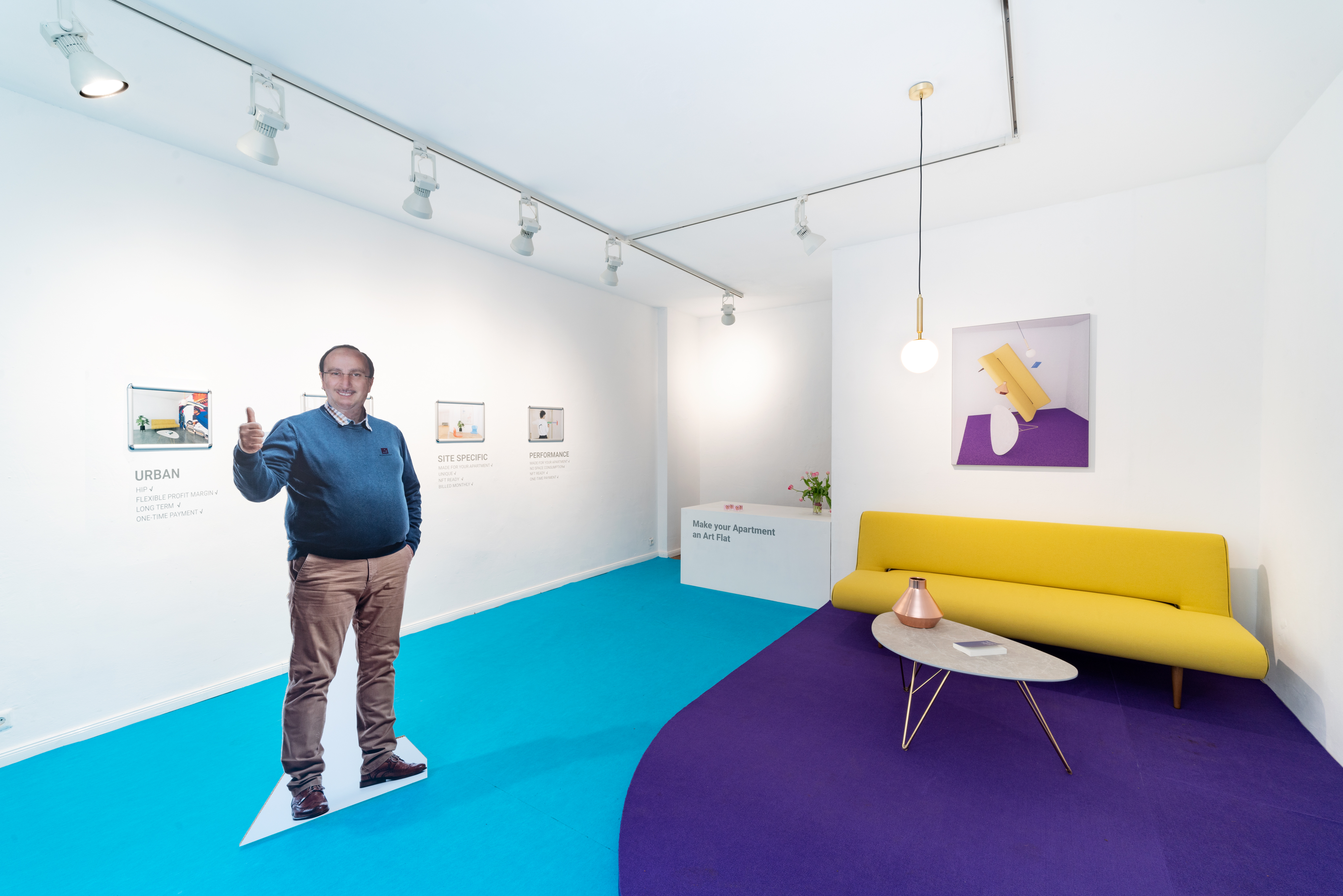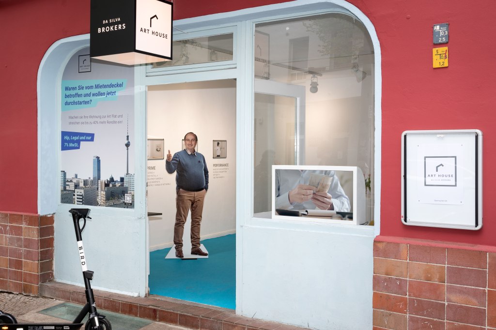 Links des Eingangs werden die vier Module präsentiert, zwischen denen Interessierte das für ihre Wohnung passende Kunstpaket auswählen können. Außerdem anwesend in Form eines lebensgroßen Pappaufstellers: CEO Hermann Rumpel, nach dessen brasilianischem Alter Ego, Antonio Da Silva, das Unternehmen benannt wurde. Das Projekt ermöglicht es Wohnungseigentümerinnen und -eigentümern nach eigenen Angaben, die Mietpreisregulierungen zu umgehen, indem sie ihre Wohnungen mit dem „Capital asset“ Berlins – der zeitgenössischen Kunst – ausstatten.