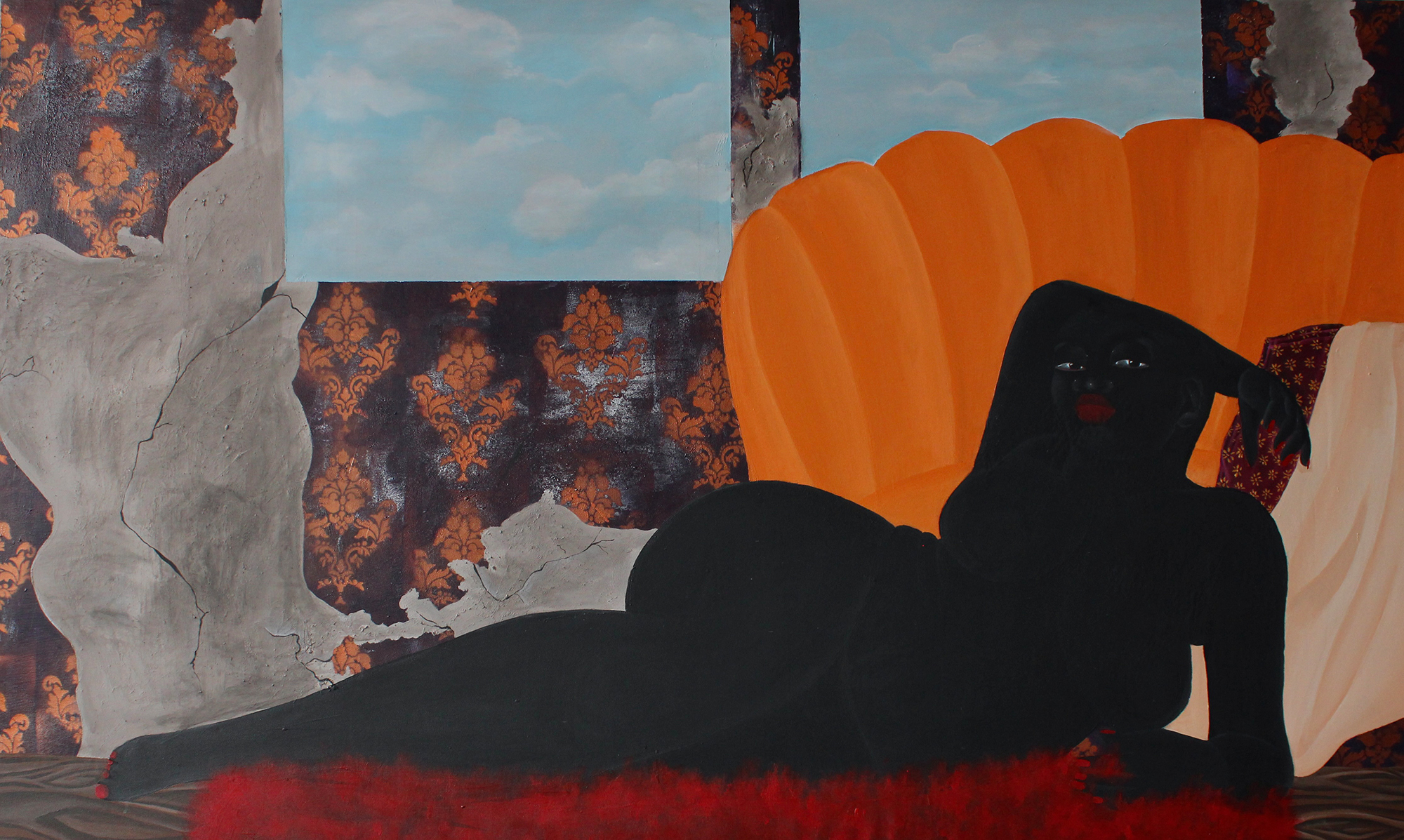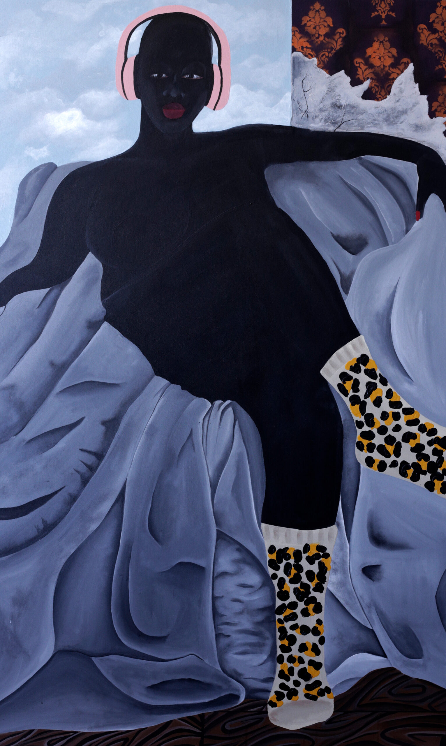 Immer wiederkehrend – sowohl in dieser Werkgruppe als auch bei vielen den anderen Arbeiten – ist der an Magritte erinnernde hellblaue Wolkenhimmel und das oft bröckelnde oder übermalte Ornament einer barock anmutenden Schmucktapete. Sie fügt weitere Materialqualitäten hinzu – Holz sowie unterschiedlichste Textilien – und kontrastiert sie mit den Körpern. Diese nehmen den gesamten Bildraum ein, gehen zuweilen auch über ihn hinaus, so dass hier und da die Füße, Hände oder Beine nicht im Bild sind. Begrenzungen spielen keine Rolle, die 120×200 Zentimeter messenden Leinwände scheinen schlicht nicht groß genug zu sein, um die Frauen vollständig zu fassen. Doch genau darum geht es ja, nicht ins Bild zu passen.