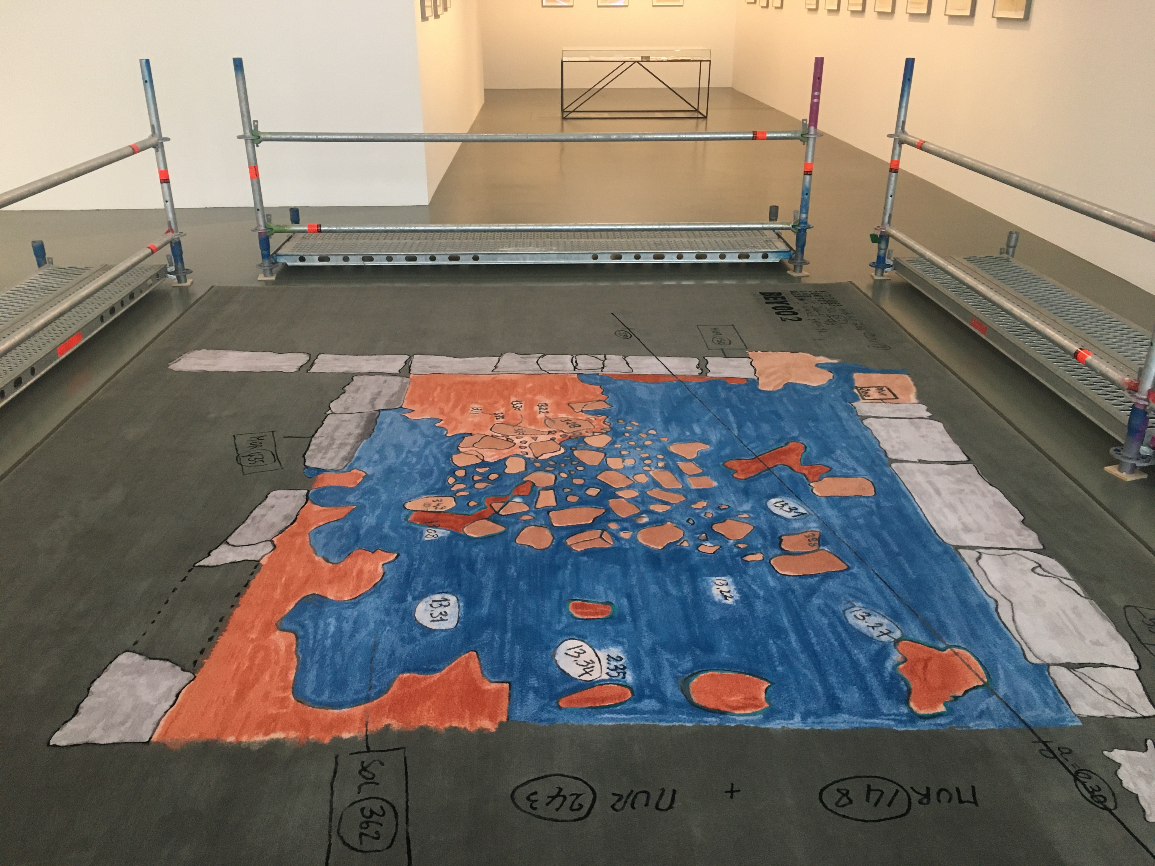 Als eine „Geste der Verzweiflung“ bezeichnet Paola Yacoub (*1966 in Beirut, Libanon) in ihrem Ausstellungstext die Übertragung einer ihrer Aufzeichnungen von der Ausgrabungsstätte BEY002 auf einen Teppich in der daadgalerie.