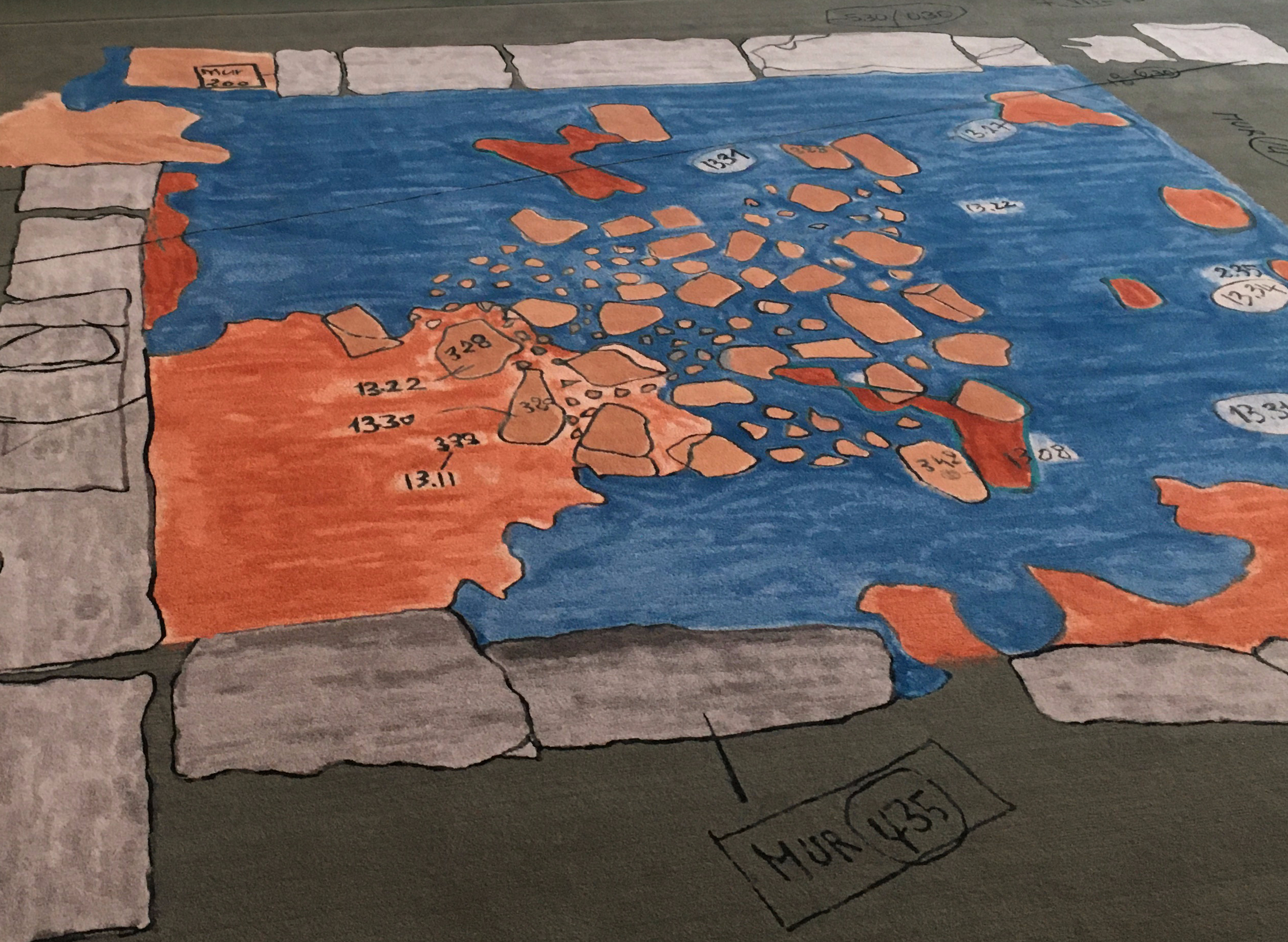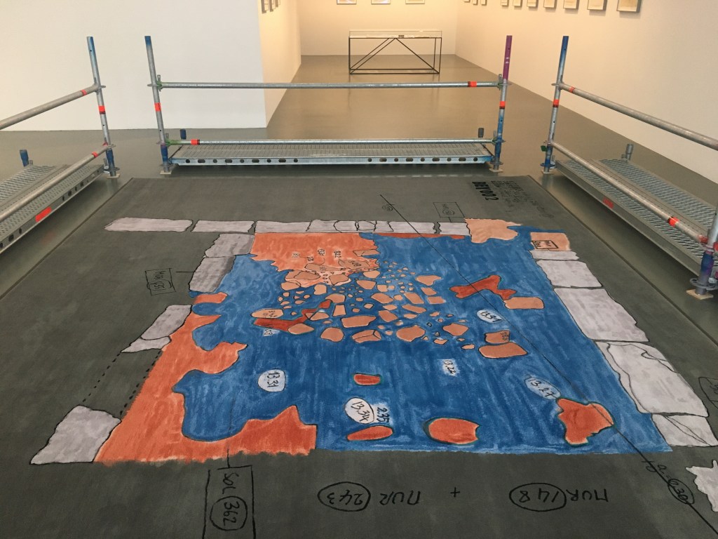 So weit, so schlicht, scheint es. Die Zeichnung einer archäologischen Ausgrabung wurde auf einen Teppich übertragen – zugegeben nicht irgendein Teppich, sondern einer aus der altehrwürdigen Pariser Manufacture Nationale des Gobelins.