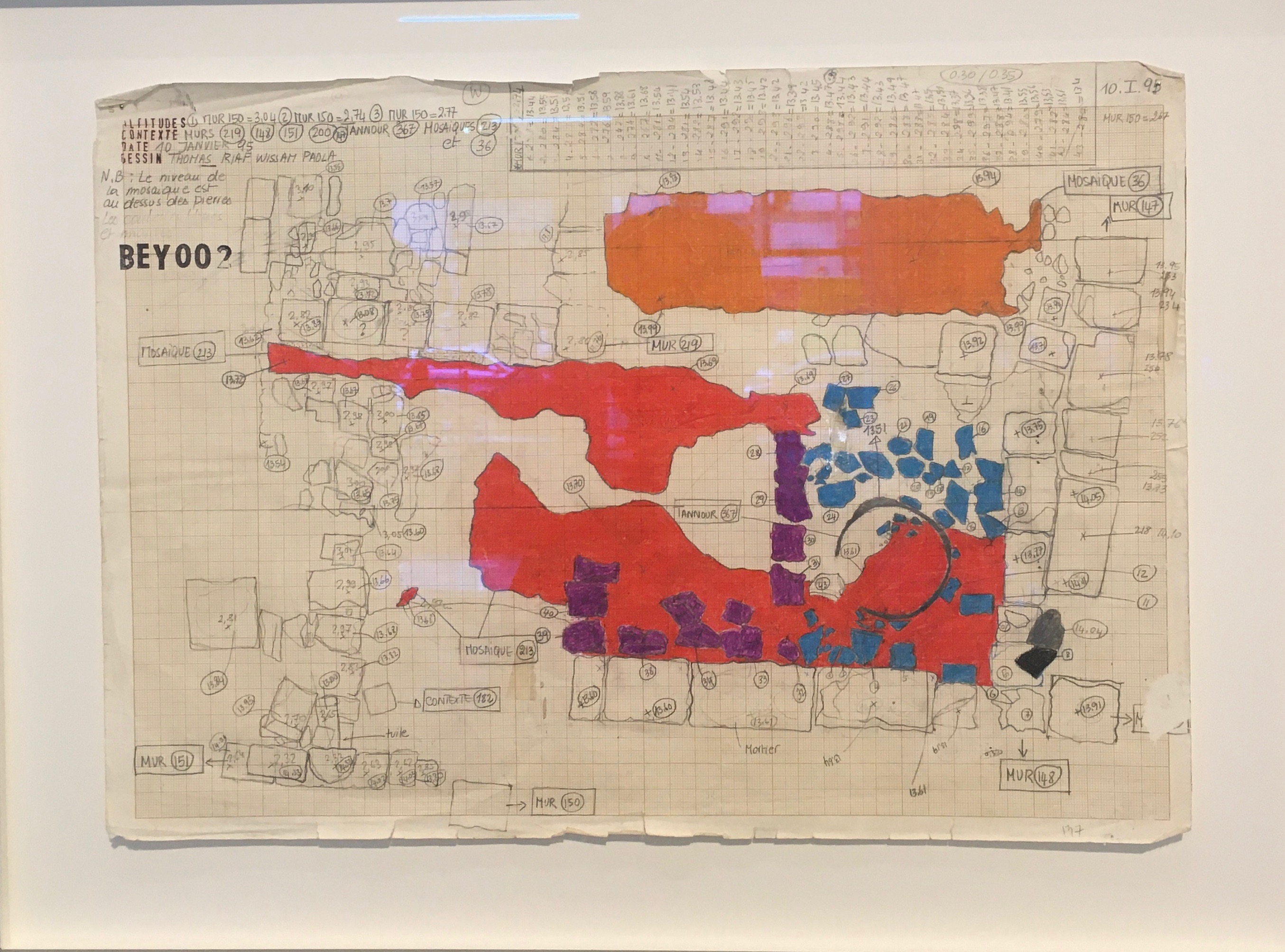 Yacoub, die auf BEY002 dafür verantwortlich war, die unterschiedlichen freigelegten Schichten zeichnerisch festzuhalten, entwickelte einen grafischen Code, der die Interpretation ihrer Aufzeichnungen vereinfachte: Jeder Schicht ordnete sie eine eigene Farbe zu. Das Ergebnis wird in der daadgalerie nicht nur in Form des Teppichs veranschaulicht, sondern auch in den gerahmten Protokollen. Auf dünnem, teilweise eingerissenem Millimeterpapier sind komplexe Skizzen zu sehen. Sofort springen die bunten, kräftigen Farben ins Auge, sie verleihen den Notizen eine ganz eigene Ästhetik, machen sie ein Stück weit zugänglich. Und trotzdem verschließen sich die Dokumente einer unmittelbaren Lesbarkeit.