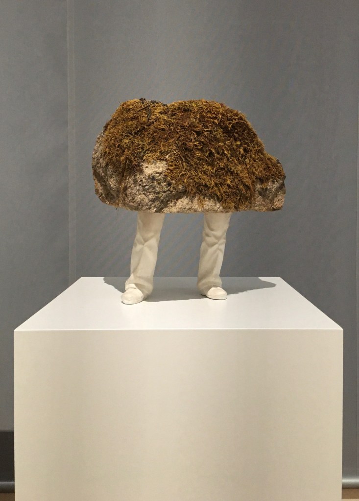 Im ersten Raum begegnet die Besucherin Mischwesen unterschiedlichster Ausprägung: Da verwandelt sich die Nymphe Daphne auf der Flucht vor dem zudringlichen, unfreiwillig liebestollen Sonnengott Apoll in einen Lorbeerstrauch (Lorenz Lingg (1582–nach 1639), Entwurf für ein Mittelbild mit Apoll und Daphne(1606)) und Erwin Wurm kombiniert in Stone (2019) lässig dastehende Beinpaare mit moosbewachsenen Steinen zu grotesk-komischen Steingestalten. Während in ihnen der Verweis auf die derzeit stattfindende gesellschaftliche Verhärtung mit einem Augenzwinkern daherkommt, nimmt sich Julio González‘ (1876–1942) stacheliger, aus Eisen konstruierter Kaktusmensch II (Kaktusfrau) (1939/40) weitaus ernster aus: Hier scheint kein Platz mehr für ein Innenleben zu sein. Ist diese metallische, mit Nägeln versehene, ausgehöhlte Daseinsform die Rettung vor der sich anbahnenden menschlichen Katastrophe oder die drohende Konsequenz? Der katalanische Eisenplastiker González starb noch vor Ende jenes Kriegs, der die Frage, was ein Mensch seinen Mitmenschen sein kann, in neue Dimensionen rückte.