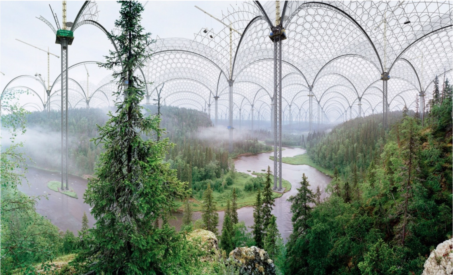 Merklich finsterer wird es gegen Ende der Ausstellung: Die Betrachtung von Ilkka Halsos (*1965 in Orimattila, lebt in Orimattila, Finnland) Werken schwankt zwischen Faszination und Unbehaglichkeit. Allzu sehr schwappen seine fotografischen Inszenierungen, die das Bild eines gewandelten Planeten heraufbeschwören, in unsere Wirklichkeit. Angesichts des „sich anbahnenden ökologischen Desasters“, so der Beschreibungstext seiner Arbeit Kitka River (2004), die zur Serie Museum of Nature gehört, entwirft der Künstler Szenarien, um „Restbestände an Natur zu konservieren“.