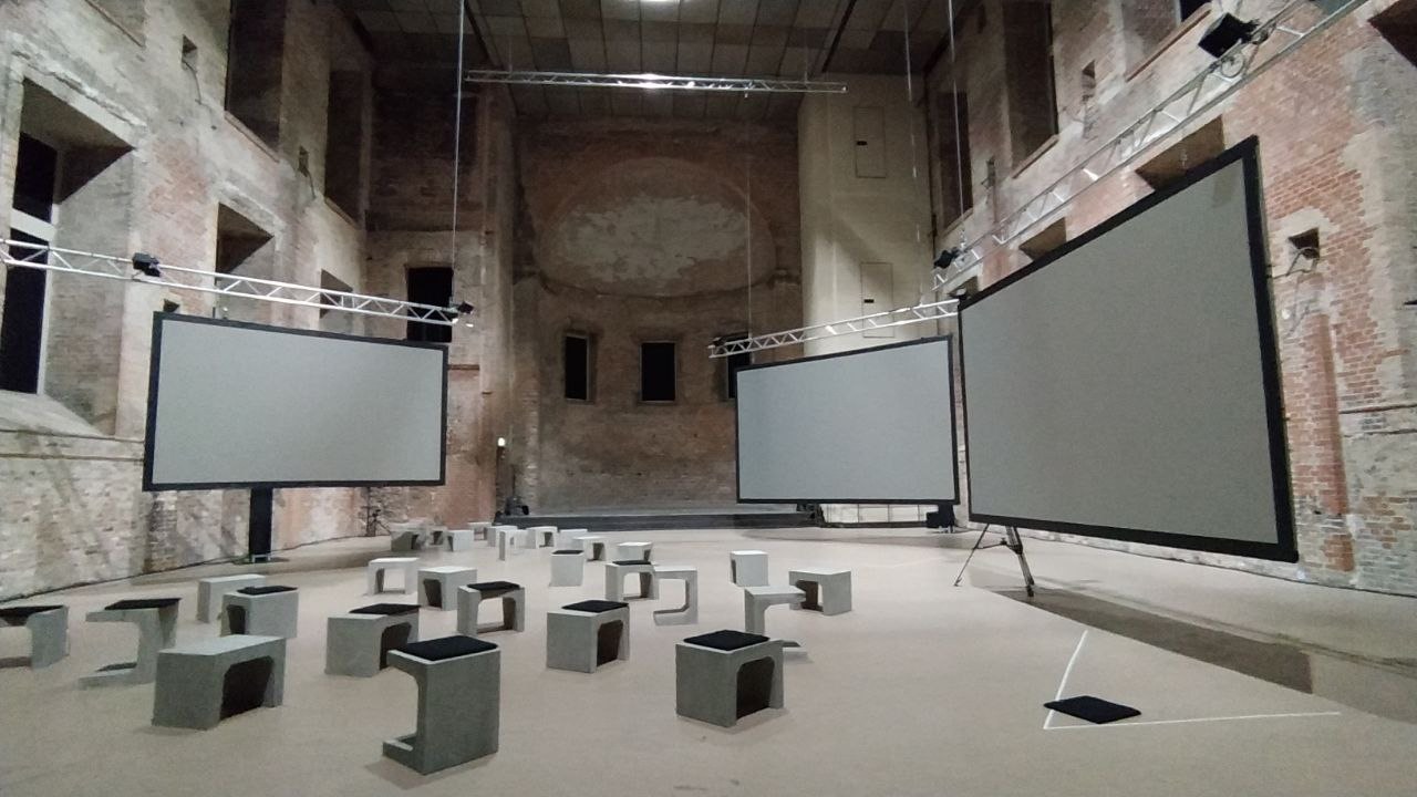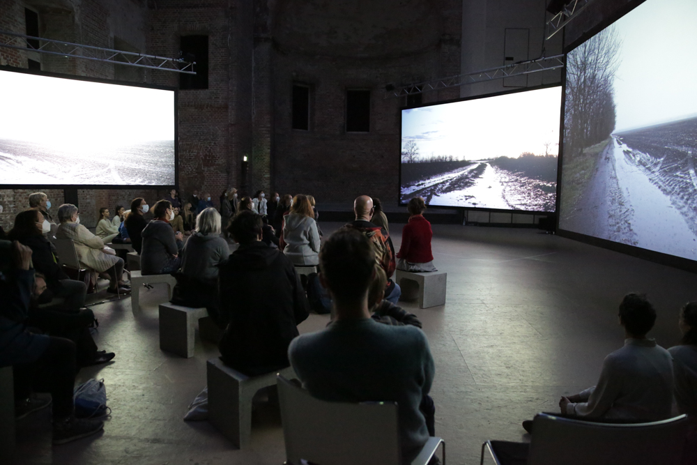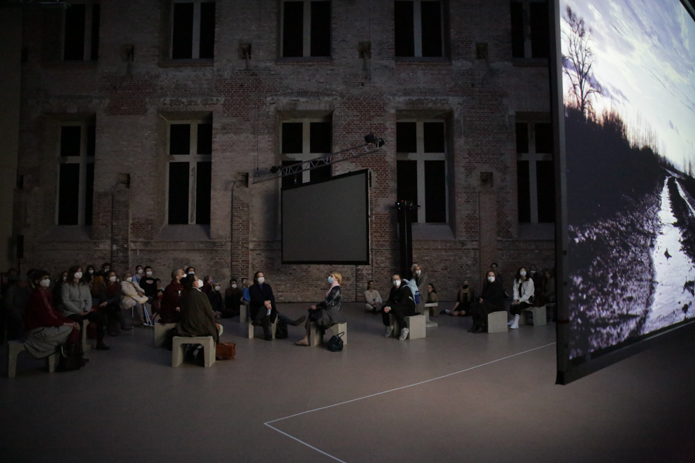 Drei großformatige Projektionswände hängen an Traversen von der 13,5 Meter hohen Decke der St. Elisabeth-Kirche in der Invalidenstraße 3, zwei auf der rechten, eine auf der linken Seite. Sie unterbrechen die Ausrichtung des Blickes und der Aufmerksamkeit auf die Apsis und schaffen stattdessen mehrere Bereiche, die einerseits voneinander getrennt, andererseits miteinander verbunden sind. Außen und Innen, Hier und Dort – all das geht in dieser Anordnung ineinander über, lässt sich nicht wirklich voneinander trennen. Für die Besucher*innen stehen in dem ansonsten leeren Kirchenraum Betonhocker bereit, die ebenfalls keine Blickrichtung vorgeben. Und dann ist da noch der Hinweis, den man bei Betreten der Kirche erhält: Man könne sich gerne während der Performance bewegen, den Platz wechseln. Die (Hör-)Perspektive ändern.