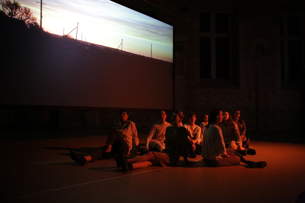 Ihre Gesänge wechseln sich ab mit denen der weiblichen Performerinnen vor Ort, die, immer wieder ihre Positionen im Raum wechselnd, singend miteinander kommunizieren. Es entsteht der Eindruck einer starken Verbundenheit zwischen den jungen Frauen, die von den unterschiedlichen Stellen des Innen und Außen, des Hier und Dort Kontakt zueinander halten.
