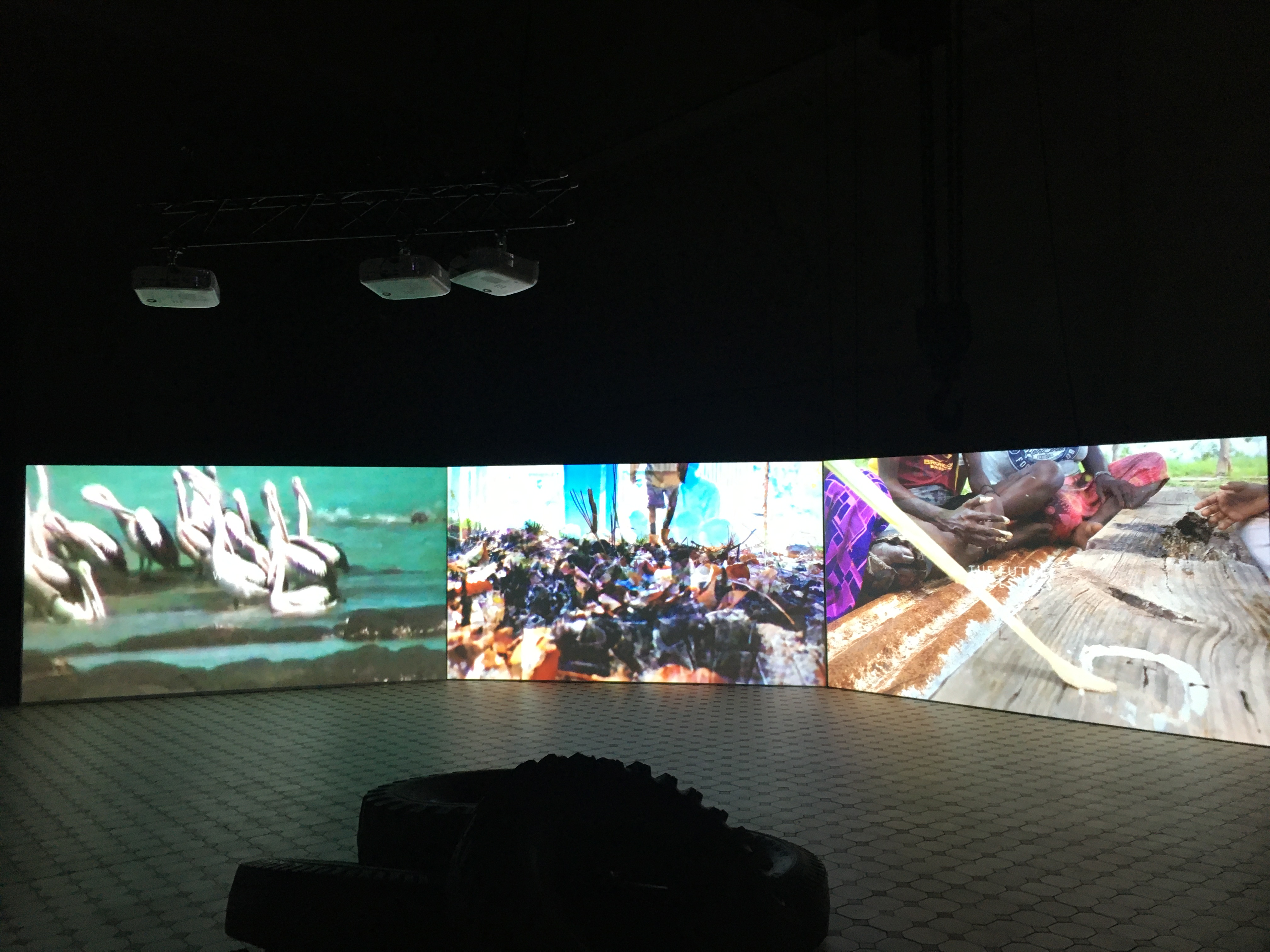 Und auch die Mahnung „wir sind die zukünftigen Vorfahren“ („we are the future ancestors“), die immer wieder auf den beiden äußeren Projektionswänden der Dreikanalinstallation erscheint, kann durchaus auch als ein Appell an die hiesige Rezipientin verstanden werden.