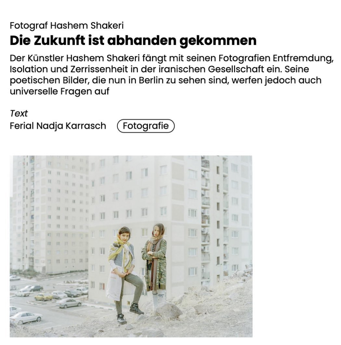 Shakeris Arbeit in Berlin zu zeigen sei ein Herzensprojekt, so Vowe. Der Künstler, Fotograf und Filmemacher erlaube wichtige Einblicke in die iranische Gesellschaft. Die Ausstellung steht auch im Kontext des Engagements der Galeristin Sadighi im Zuge der gegenwärtigen Situation in ihrem zweiten Heimatland Iran: Im vergangenen November präsentierte Sadighi in den Kantgaragen eine von ihr konzipierte Installation, die sie den Frauen im Iran widmete und schuf eine Plattform für die iranische Diaspora in Berlin.