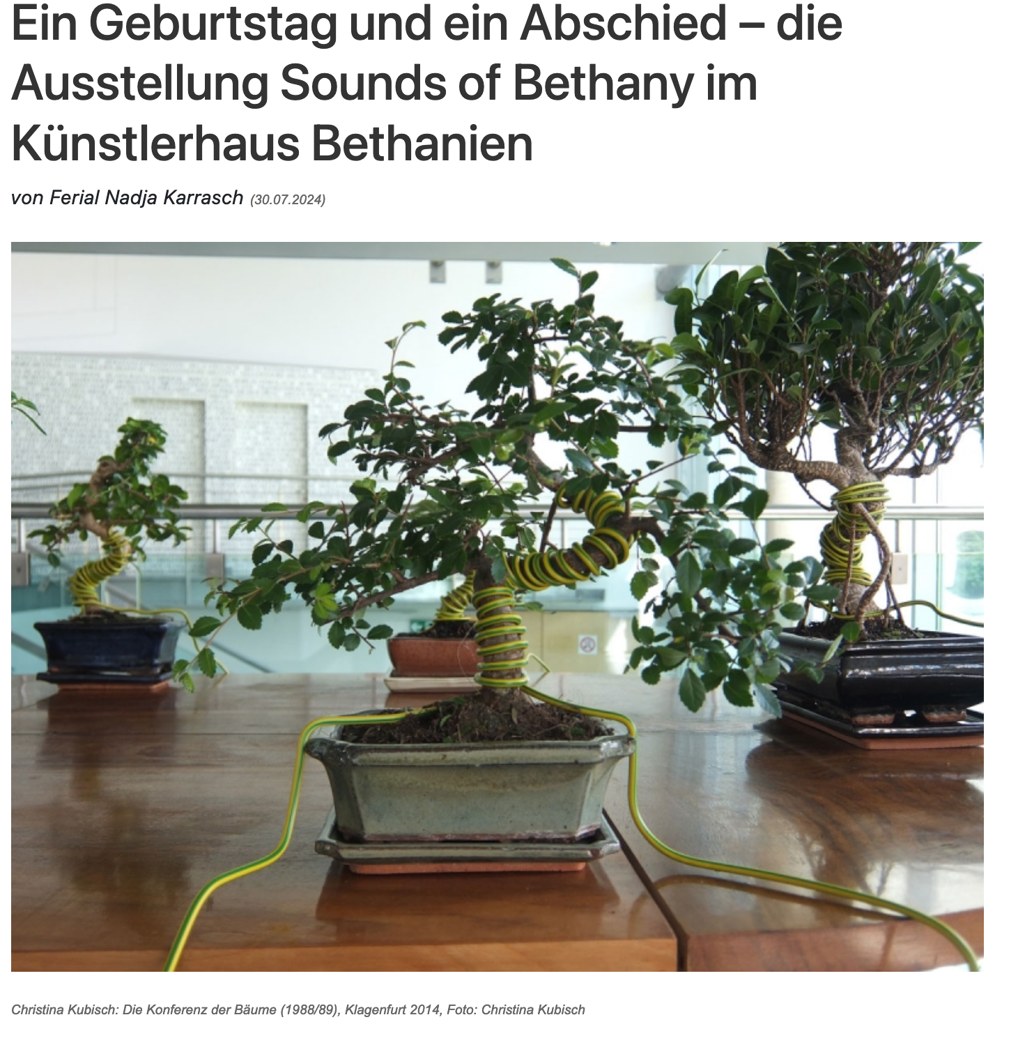 Die Ausstellung ist tatsächlich ein Fest – ein Fest des Hör-Sinns. An jeder Station wartet ein neues auditives Erlebnis und vielerorts wird zu Interaktion eingeladen: Die Besucherin scannt Kupferstreifen und taucht ein in eine Klangwelt aus Bienensummen, tropischen Stürmen und den Geräuschen unterschiedlicher Böden (Raviv Ganchrow, Spark Reach, 2018-2019/ 2024). Sie lauscht Schallplatten aus Eis (Claudia Märzendorfer, Frozen Records Archive, 2005-2024) und umrundet klingende Bonsai-Bäume. Die Klangkünstlerin Christina Kubisch (geb. 1948, lebt in Berlin) entwickelte ihre Installation Die Konferenz der Bäume (1988/89) als Statement gegen die politischen Konferenzen der 1980er Jahre, in denen die Natur keine Rolle spielte. Die Plätze an dem Rundem Tisch werden hier von fünf Bonsais eingenommen, die mit Erdungskabeln umwickelt sind. Ausgestattet mit elektromagnetischen Kopfhörern kann die Besucherin den Tisch umrunden und den individuellen Klangstimmen der Bäume zuhören.