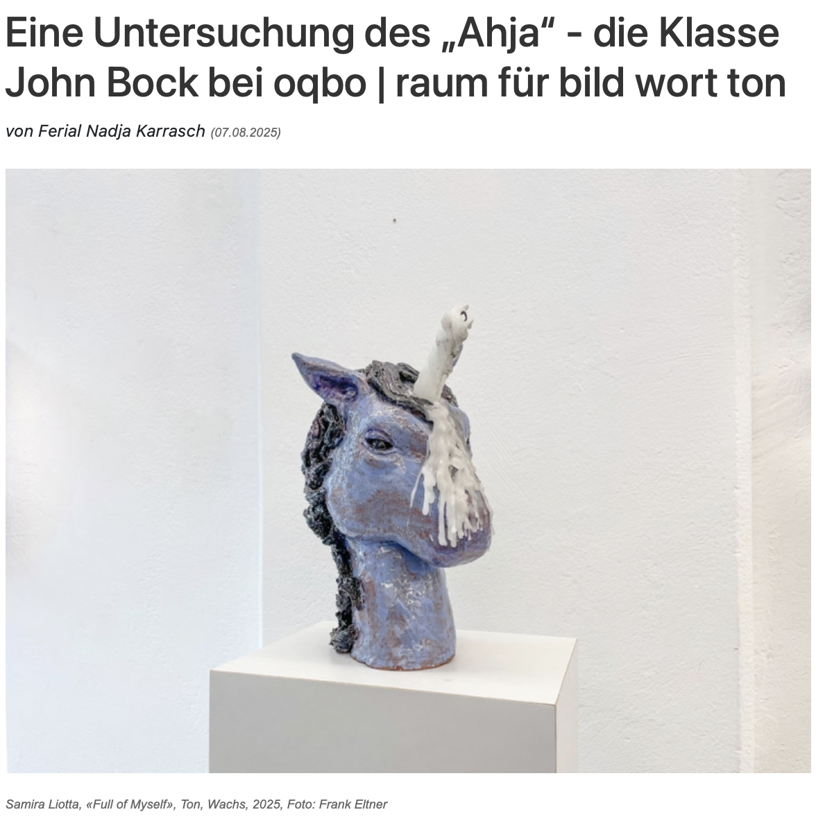 Der Ausstellungstext zu Ahja. Klasse John Bock mit Arbeiten von Studierenden der Staatlichen Akademie der Bildenden Künste Karlsruhe bei oqbo | raum für bild wort ton ist eine wie ein Gedicht anmutende Reflexion über die äußerst dehnbare Bedeutung der Äußerung „Ahja“.